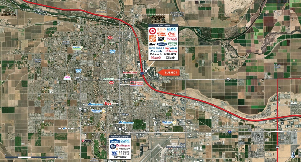 Yuma Palms Regional Power Center Approximately 10.4 Million Visits Per Year Several National Tenants also rank in the top of their entire chain. 11 National Tenants at Yuma Palms Rank 1st to 4th in the entire state of Arizona. 6 National Tenants at Yuma Palms Rank 6th to 11th in the entire state of Arizona. Harkins Theater, Target, Ross, Best Buy, Marshalls, JC Penny, Dillards, Sam’s Club, Kohl’s, Petsmart, Michael’s, Old Navy, Ulta are just some of our Box Tenants. Chipotle, Red Lobster, In N Out, Panda Express, Del Taco, Olive Garden and Black Bear Diner are just some of our food operators. Two Pads available for Ground Lease. Join other outlot users Chili's, Jack In The Box, Famous Dave's BBQ, Red Lobster, Olive Garden, In-N-Out, Black Bear Diner and Discount Tire. Only a handful of opportunities left available.