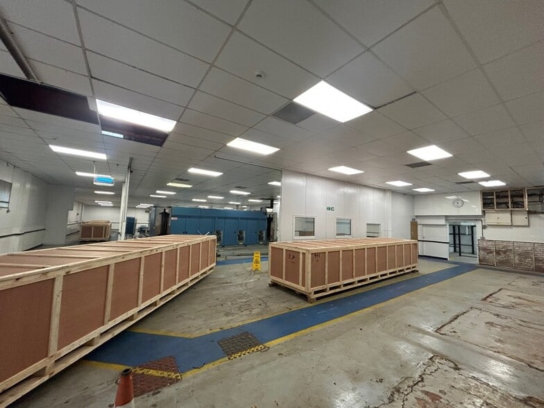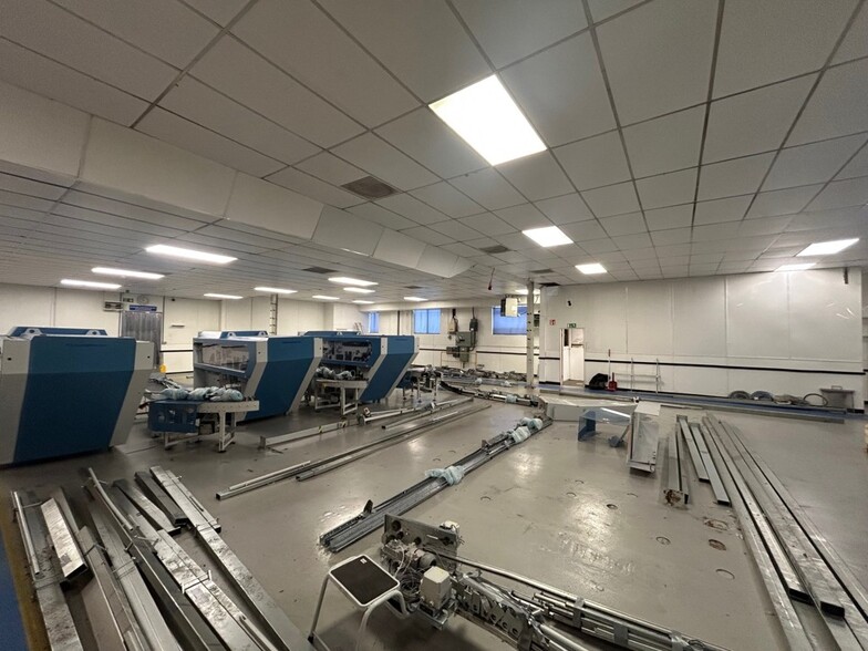 The property comprises an open-plan warehouse facility accessed via two roller shutter doors, with an internal eaves height of approximately 3.5 metres. The unit has previously been used as a launderette and is therefore presented in good, clean condition throughout. The accommodation benets from a full suspended ceiling incorporating modern LED lighting and is considered suitable for a variety of uses, subject to the necessary planning consents. Externally, the property provides dedicated parking and loading areas.