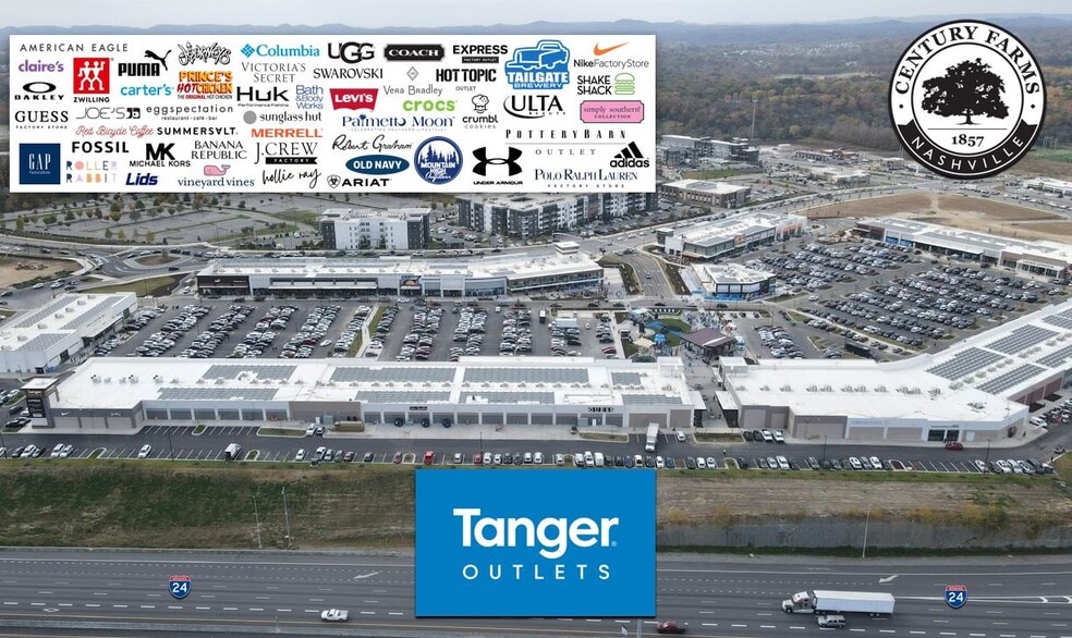 Century Farms is home to an HCA Healthcare Freestanding ER and adjacent medical office, Nashville SC Team Headquarters (Nashville's Major League Soccer franchise), A 2,000-employee CHS Healthcare office, a 100% leased Tanger Outlet Center with 70+ national retail brands, PopStroke by Tiger Woods, Texas Roadhouse, First Watch, Chipotle, CAVA, PNC Bank, Panera Bread, Wilson Bank, Ideal Dental, XFINITY Store, Whataburger, Tropical Smoothie Cafe, Shake Shack, Thornton's, Arby's and 1,000+ upscale multifamily units.