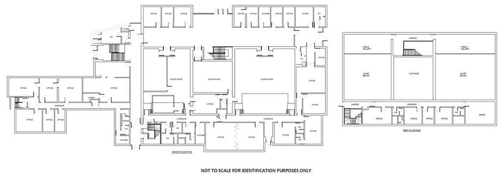 The ground floor is centred around three courtrooms, with vaulted public viewing galleries in the outer two courts. Ancillary accommodation, including offices, kitchens and WC facilities, are positioned around the courtrooms off a hallway. The main entrance, accessed from Civic Drive, is positioned centrally at the front of the property, with an accessible entrance situated at the side.
