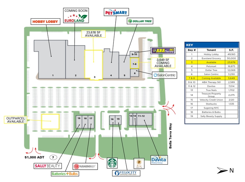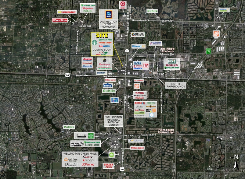 Positioned in the heart of Royal Palm Beach, this high-performing regional power center offers exceptional visibility and access along State Road 7, one of Palm Beach County’s most dynamic retail corridors. The center is anchored by nationally recognized retailers including Hobby Lobby, PetSmart, Dollar Tree, and Starbucks, with Euroland coming soon, creating a strong draw for consistent customer traffic. Multiple access points, including signalized entry from Bella Terra Way, ensure convenient ingress and egress, complemented by ample parking for tenants and visitors. Pylon signage opportunities are available for anchor tenants, enhancing brand exposure along a corridor that sees approximately 51,000 vehicles daily. Surrounded by dense residential neighborhoods with upper-income demographics, the property benefits from a robust consumer base and proximity to major national retailers such as Costco, BJ’s Wholesale Club, Super Target, Walmart Supercenter, and Whole Foods. This prime location is just minutes from the Florida Turnpike, offering unmatched connectivity and positioning within one of Palm Beach County’s fastest-growing submarkets.