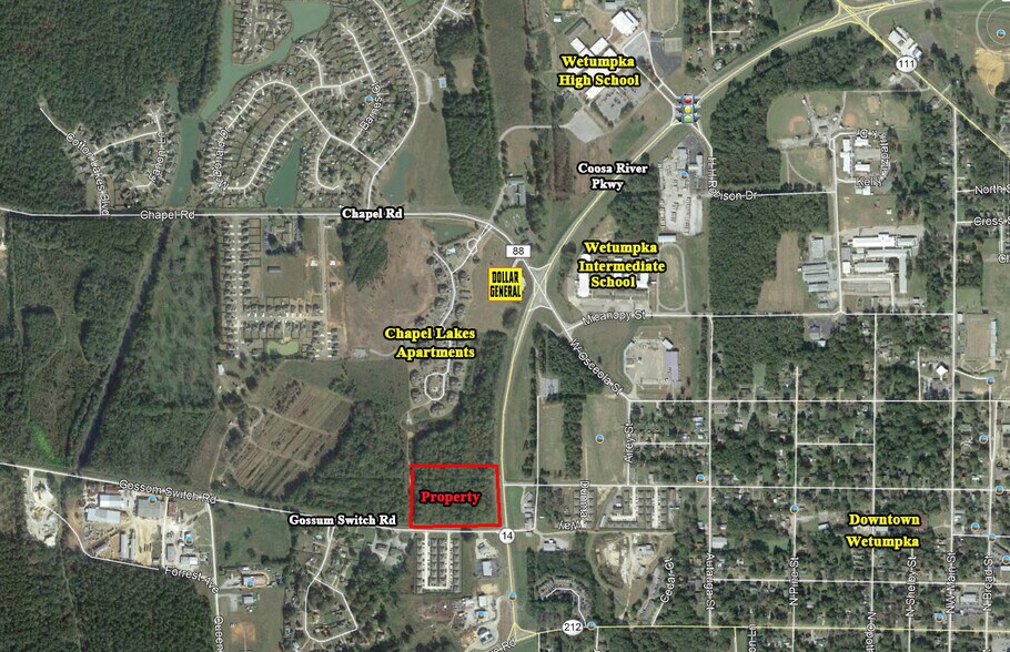 Great opportunity for commercial development at corner of Coosa River Parkway and Gossum Switch Road in Wetumpka, Alabama. Priced as an entire parcel. Seller will divide and price accordingly. Adjacent to Chapel Lakes Apartments (152 units).