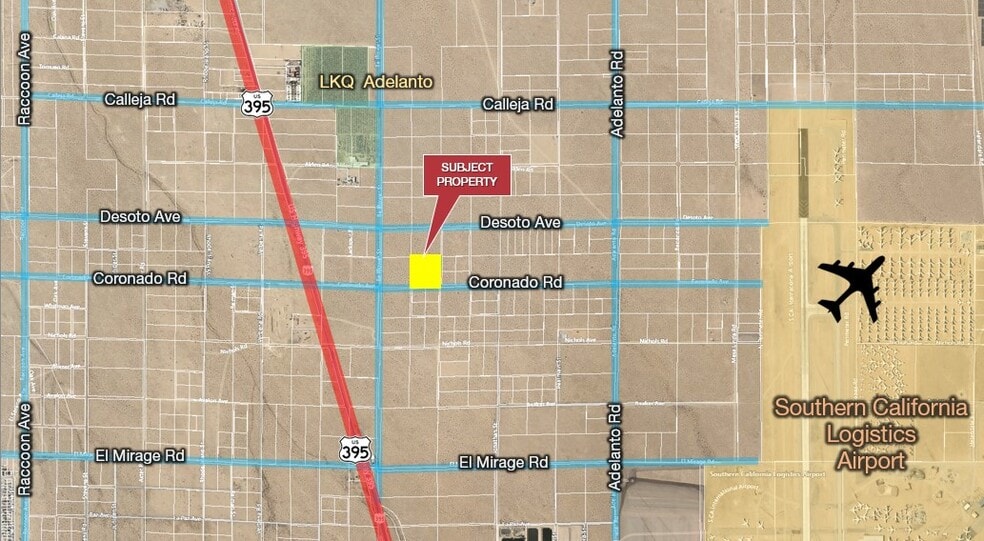 ±10 acres of unimproved industrial land for sale on Coronado Ave in Adelanto; APN: 0459-391-22. Zoned Airport Development District (ADD) this lot permits for a variety of industrial and commercial uses, including warehousing, truck parking, outdoor storage, and cannabis cultivation. This location is also within a Qualified Opportunity Zone and eligible for potential tax benefits. Neighboring businesses LKQ Auto Parts & Salvage, Thi?n Vi?n Chân Nguyên Buddhist Meditation Center, West Victor Valley Shooting Club, and more. This location is in proximity to support the Southern California Logistics Airport, whose tenant roster includes Amazon, Boeing, GE Aviation, Kuerig Dr. Pepper, M&M/Mars, Newell Rubbermaid, and more. Less than one-half mile to Highway 395, 12 miles to Interstate 15, and 70 miles to the Ports of Los Angeles. This site is also approximately 25 miles from BNSF’s future Barstow International Gateway (BIG), a state-of-the-art intermodal facility spanning 4,500-acres designed to revolutionize international logistics and distribution regionally and domestically. Buyer to verify all information contained herein. Agent and their representatives are not responsible for the accuracy of these claims.