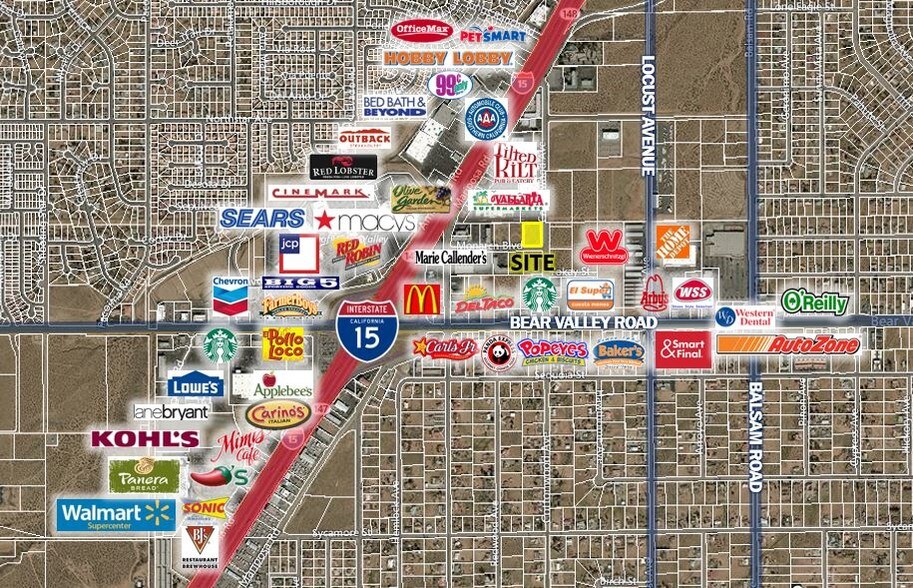 ***FLAT CORNER COMMERCIAL LOT APPROXIMATELY ¼ MILE FROM INTERSTATE 15 FREEWAY ON RAMP*** AND LESS THAN A MILE FROM THE MALL OF VICTOR VALLEY. ADJACENT TO VALLARTA SUPERMARKET, TILTED KILT PUB, AMERICAS TIRE, WALKING DISTANCE TO COMFORT SUITES, TRAVELODGE, VICTOR BOWL, MARIE CALLANDER’S, STEAK’N SHAKE, KFC AND MCDONALDS. ZONED C2 – GENERAL COMMERCIAL CENTRALLY LOCATED TO FREEWAY, PUBLIC TRANSPORTATION, RESTAURANTS, HOTELS AND SHOPPING Interstate 15 to Bear Valley Road east to Cottonwood North to PIQ