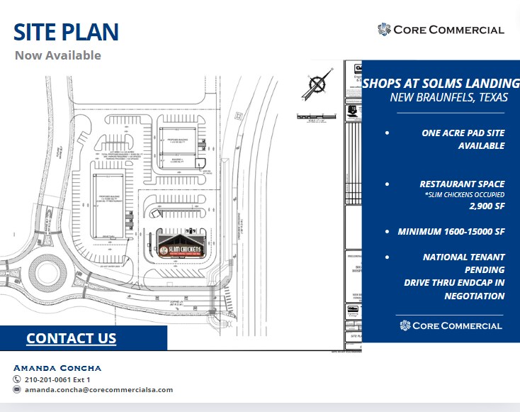 Shops at Solms Landing is located at the main entrance of Solms Landing.? A major 98 acres development in the middle of the second fastest growing city in the United States New Braunfels, Texas.? Solms Landing will integrate fine dining, upscale shopping, high end living, and class A office into a thriving mixed use development.? Now pre leasing the retail center of 15,100 SF and a one acre pad for ground lease or build to suite.?