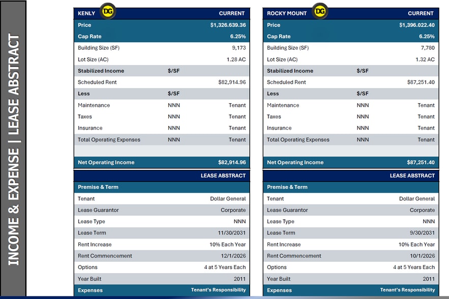 Two-property Dollar General NNN portfolio offered at a 6.25% cap. Purchase individually or together.