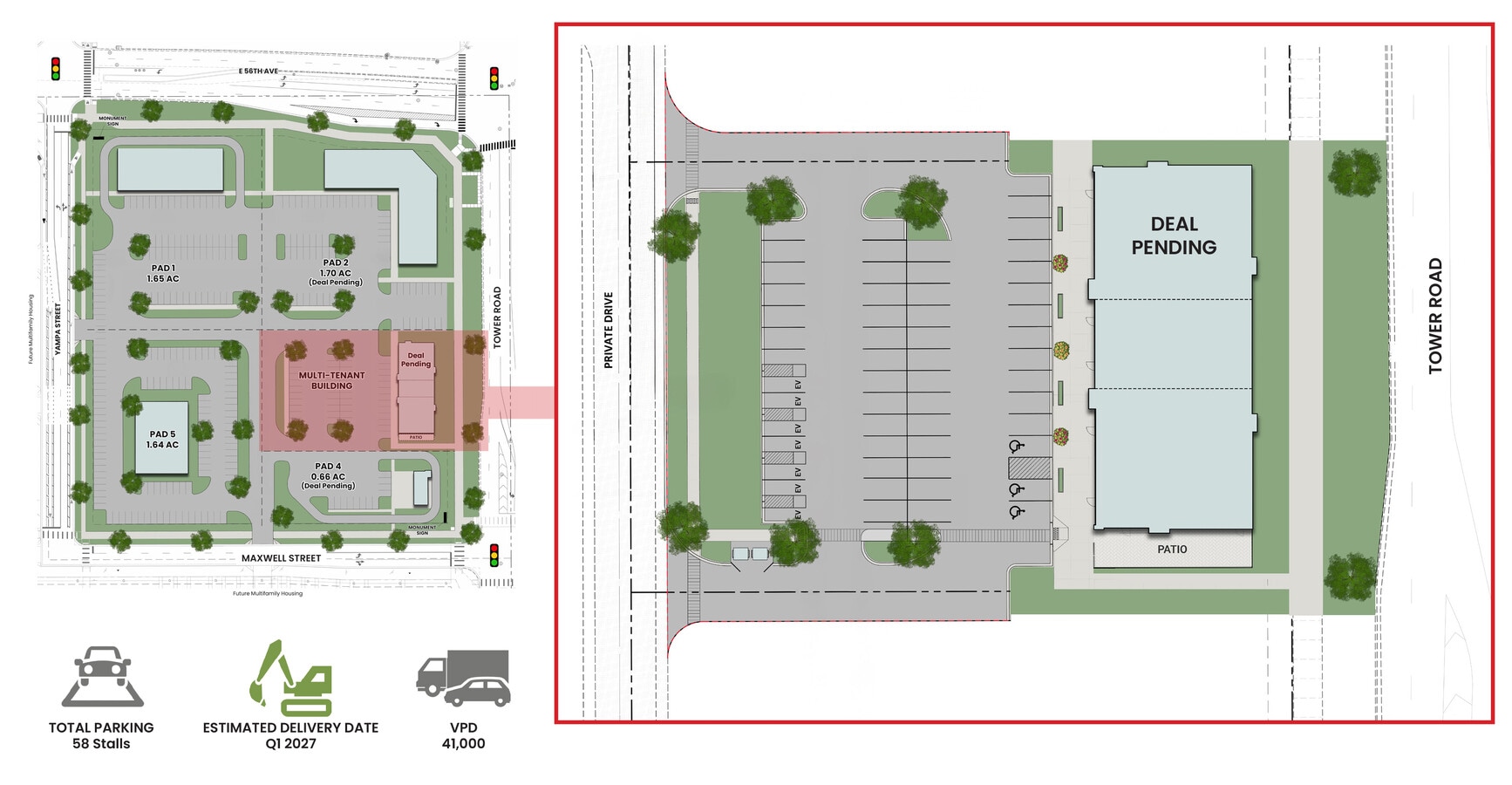 A new 9,750 SF multi-tenant retail building is planned at The Shoppes at 56th, located at 56th Avenue and Tower Road in Denver, CO. This project will offer 3 to 4 units for lease, with flexible configurations to accommodate a variety of retail users. Situated within a rapidly growing trade area, the site is adjacent to approximately 450 new residential units under development to the south and west. The location benefits from strong traffic counts and will feature modern, high-quality architecture consistent with the overall vision for The Shoppes at 56th.