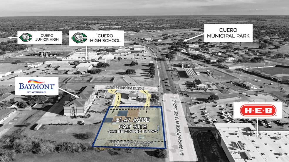 Position your business in the heart of Cuero with these rare commercial pad sites on Highway 87 and East Broadway St. Located next to the future Stir Soda Shoppe, across from Cuero High School, and near H-E-B, these sites offer unparalleled exposure and high foot traffic. Detention is completed and utilities will be stubbed out to property line of pad site. Take advantage of this prime leasing or purchasing opportunity in a high-traffic commercial corridor. The owner will sell or lease as 1-1.47-acre pad or will divide into 2 separate pads. Some restrictions apply.