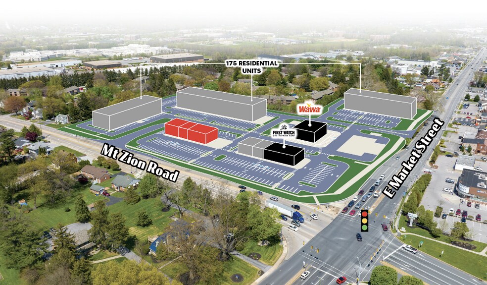 Mount Zion Commons is a brand-new mixed-use development coming to the heart of East York in the Spring of 2027. Positioned at the intersection of East Market Street (±20,000 VPD) and Mt. Zion Road (±29,000 VPD), Mount Zion Commons offers a rare opportunity for any retailer looking to enter the growing York market. Anchored by Wawa and 175 residential units, Mount Zion Commons will also feature First Watch restaurant, as well a QSR pad and 3,100 square feet of inline retail space. Mount Zion Commons is surrounded by national retailers such as: Chick-Fil-A, Home Depot, Walmart, Burlington, Giant, Weis, and more!