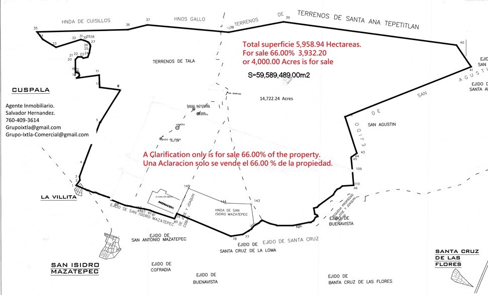 Big questions for developers. That could be done with 40,000,000.00 million of M2 or 430,556,416. SQ FT. Plus, the Hectares include. There are several Subdivisions and cities adjacent to many fractionations, offering numerous opportunities. I will provide information when I have a disclosure from the sales office or selling agent. Notice that I am the one who has authorization and completed files for this property.