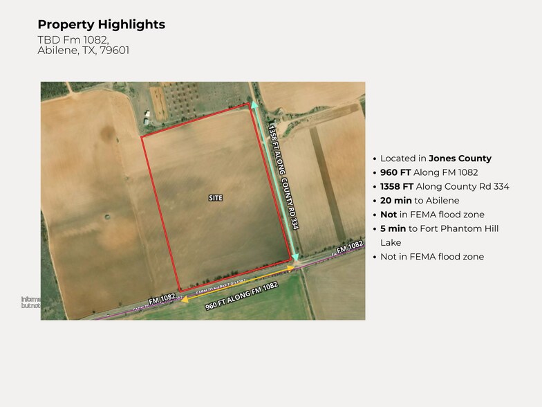 Located in Abilene, TX, this 34 acres commercial acreage presents a rare opportunity for development in a high-visibility. Currently undeveloped, the property offers a blank slate for a wide range of commercial or mixed-use possibilities. A naturally well-positioned site, elevated, and protected from major flood risk. Located in Jones County 960 FT Along FM 1082 1358 FT Along County Rd 334 20 min to Abilene Not in FEMA flood zone 5 min to Fort Phantom Hill Lake Not in FEMA flood zone