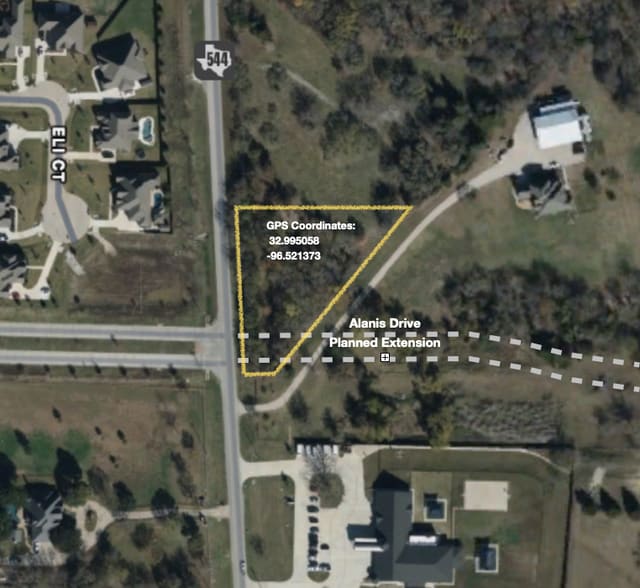 Approximately 1.5 acre wooded lot with plenty of opportunity for commercial or residential uses. The eminent widening of FM-544 to 4 lanes will improve traffic flow, plus the planned future extension of Alanis Drive will likely make this a hard corner. Great Traffic Counts of 9,125 VPD on FM 544 and 4,825 VPD on Alanis as of 2022. Located in the Wylie ETJ, potential uses include convenience store, small retail strip, quick serve restaurant, coffee shop, flex warehouse, small multifamily, or single family. Get it while you can, because, when it's gone, it's gone!