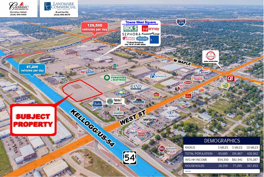 - Located: Kellogg and West - 1-4 acres available - 2 Pylon Signs - 428 parking spaces - Area Neighbors: Wichita Furniture & Mattress, Charlies Car Wash, KwikShop, Starbucks, Petsmart, Red Lobster, Casey's, and Dutch Bros (coming soon).