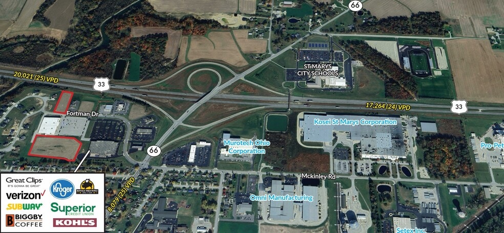 1 - 3 acre outparcels featuring highway visibility available for sale or lease in Kroger and Kohl's anchored development. Located in a City of St. Marys Community Reinvestment Area offering 10 year property tax exemption for new construction. Ideal location at the intersection of US 33 and SR 66 in St. Marys, the home of Grand Lake. Excellent visibility and easy access to US 33 and SR 66. Conveniently located within 10 miles of both Celina and Wapakoneta. At the intersection of US 33 and Sr 66 in St. Marys