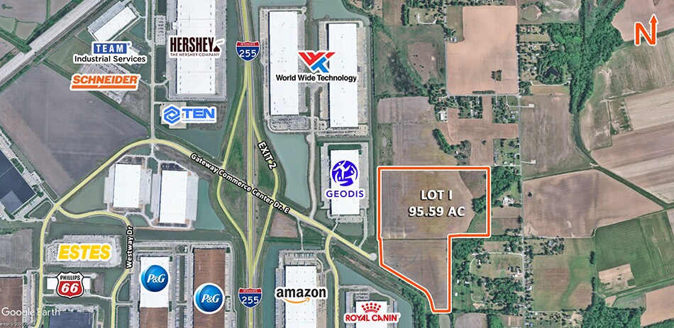 95.59 Acre Industrial Site for Sale or Build-to-Suit. The site can accommodate up to a 921,000 SF building. Situated in the Gateway Commerce Center, offering superior size, location, access, infrastructure, labor, amenities, and economic incentives. It is ideally suited for local, regional, and national warehouse and distribution users. At 2,300 acres, there is plenty of room to grow at Gateway, creating cost-efficiencies by accommodating expansion on-site. The property has plans for multiple spec building projects and existing allotments of space ranging from 100,000 to over 1,200,000 square feet. In addition, the park already has infrastructure in place to meet needs far into the future. Gateway provides high-capacity service for electric, natural gas, water, sewer, and telecommunications, making the park suitable for many different industrial uses. All roads in the park are designed to interstate standards, with 40-ton vehicle rating. St. Louis is one of the few regions nationwide that enjoys convenient access to four modes of transportation: road, rail, water, air. The availability of so many options provides the community with some of the lowest shipping costs in the country.