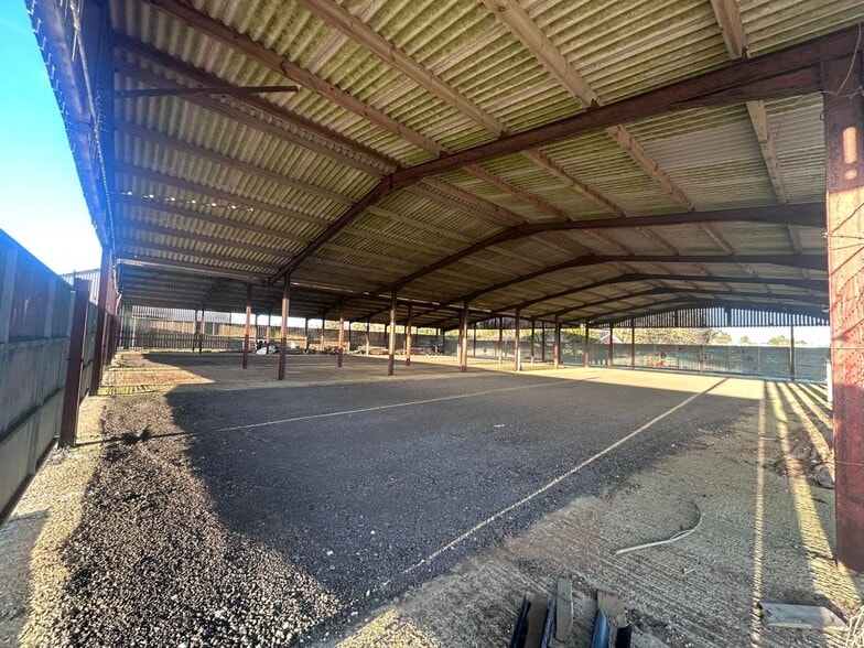 Comprises two interconnected open span former agricultural buildings, with a mixture of concrete and compacted road planings surfaces.