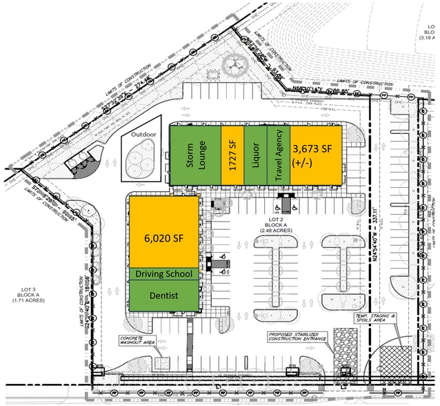 End Cap w/ 1750 gl grease trap New construction retail shell space – Building 2 at The Shoppes at Wells Branch. Total building size: 12,320 SF. Occupancy classification: Group M – Mercantile. Construction type: Type IIB. Building is designed as 100% sprinklered (NFPA 13 system – deferred submittal). Space is delivered as shell only; all interior layout, plumbing fixture counts, egress calculations and occupant loads to be provided and approved during tenant finish-out. Maximum allowable building height: 50’-0”; actual building height: approximately 25’-0”. Automatic fire sprinkler drawings and calculations to be provided by tenant’s licensed fire protection contractor as part of finish-out. All accessibility and life-safety requirements to be completed during tenant build-out in accordance with applicable codes and Texas Accessibility Standards.