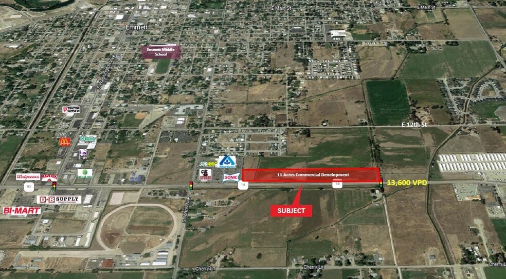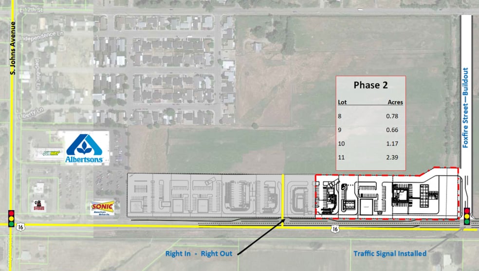 • Prime pad sites available for land lease or build-to-suit located at the main entrance into Emmett. • Highway 16 expansion will result in a population boom in Emmett. • Located next to Albertsons, Stinker, Sonic, Subway, and Papa Murphy’s. • 1/2 mile away from major retailers such as Walgreens, D&B, McDonalds, Taco Bell, Maverick, and O’Reilly Auto Parts. • ~11 pads with flexible lot sizes. • Zoned Commercial • Future traffic signal proposed on Southeast corner of property with access connecting to HW16 to E. 12th Street.