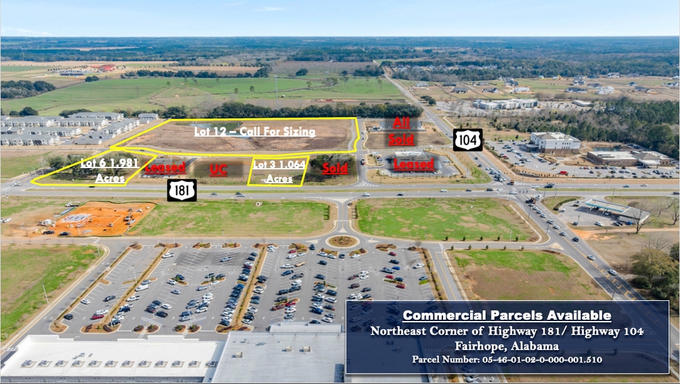 New development in Fairhope, AL with commercial outparcels available with frontage on Highway181/ 104. Build to suit, ground lease, or sales are available. Most size parcel can be met, however, please call for further information.