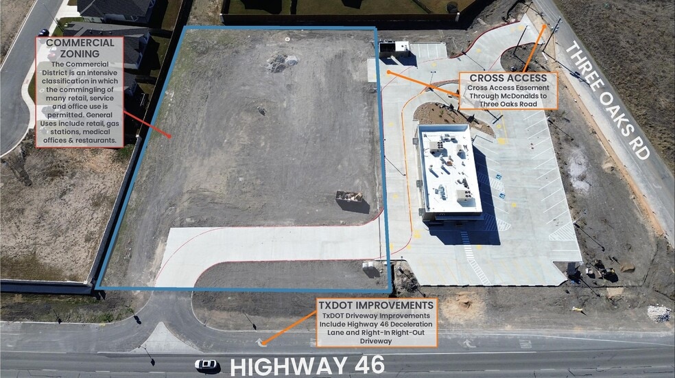 ±1.47-acre platted commercial tract situated at the future signalized hard corner of Highway 46 and Three Oaks Road. The generally level site is zoned Commercial and fully served by on-site water and sewer. With more than 200 feet of frontage along Highway 46, a fully constructed right-in right-out driveway onto Highway 46, along with cross-access through the adjacent McDonald’s tract to Three Oaks Road, the Property offers excellent accessibility and visibility. An off-site stormwater detention basin has been constructed within the adjacent residential subdivision to serve the site, providing significant land and development cost savings. Additionally, an approved water service agreement with Springs Hill provides up to 10 reserved and immediately available EDUs, allowing for a broad range of commercial development opportunities.
