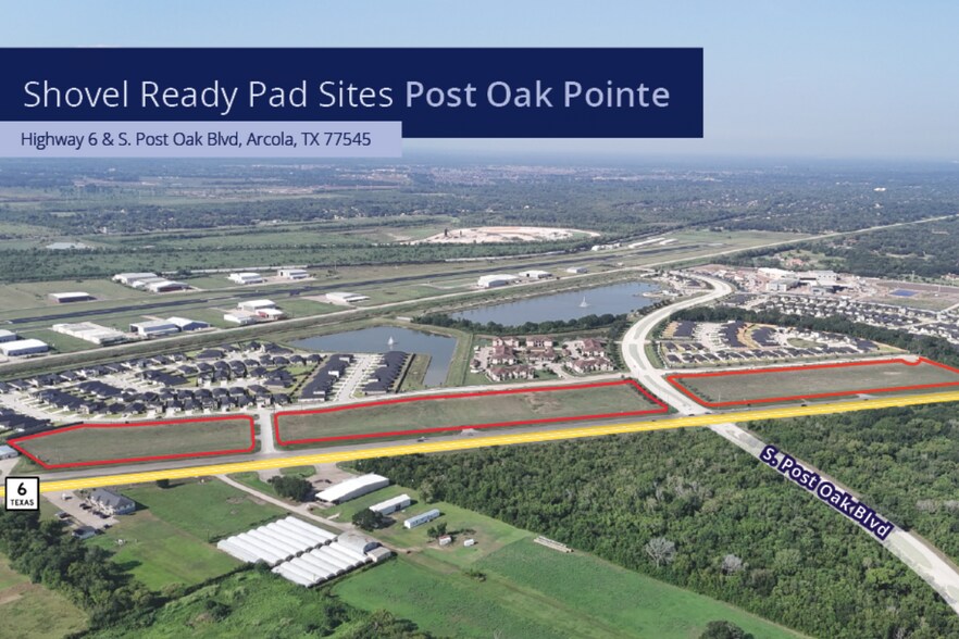 Post Oak Pointe This shovel-ready land including in-place utilities, offsite Atlas-14 compliant detention, and completed Hwy 6 driveways, offers immediate development potential at the intersection of growth in Arcola, Fresno, and Sienna. Local government (City of Arcola) is highly motivated to attract commercial growth and is committed to working swiftly from plat to permit with end users. 1 - ±1.71 Acres - $16psf 2 - ±2.00 Acres - $16psf 3 - ±2.00 Acres - $16psf 4 - ±2.00 Acres - $25psf 5 - ±2.00 Acres - $25psf 6 - ±2.00 Acres - $16psf 7 - ±2.00 Acres - $16psf 8 - ±1.69 Acres - $20psf 9 - ±1.625 Acres - $20psf 10 - ±1.631 Acres - $16psf