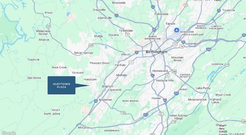 Hueytown Plaza consists of 3 standalone buildings totaling 43,650 SF on a 4.8-acre lot, built in 1965 and well-maintained. The center is 100% occupied by 9 tenants, generating $230,582 in annual NOI, with ample parking, excellent visibility, and on-site signage. Located along a high-traffic corridor in Bessemer/Hueytown, the property benefits from a stable retail trade area and strong tenant exposure, making it a stable, income-producing investment with long-term upside.