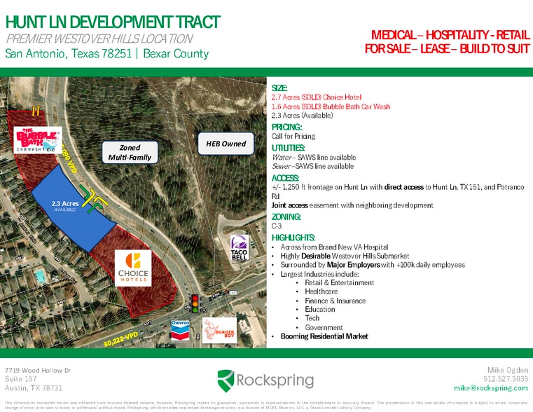 The remaining +/- 2.33 acres sits between Choice and Bubble Bath and would be ideal for many uses. We have a test layout for +12,000 sf of inline retail with end cap drive thru which can be used as site study. There is an entrance off Hunt Lane and internal driveway to Choice Hotel. Zoned C3 and is priced aggressively compared to nearby locations.
