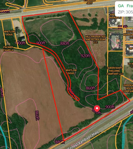 Currently farm land - generally flat to sloping, all the way back to I-85. General slope towards I-85 would most likely allow for gravity flow sewer to manhole located near I-85 at back of property. Property to the south is 8 acres with a Starbucks next to Chic Fil A with J.Peters, Holiday Inn Express, Fairfield by Mariott all a block or so away. A new Whataburger just came out of the ground across the highway. There is only one small grocery store in town, and the population is growing rapidly. Hundreds of jobs from local manufacturers are available - auto parts mostly. The town itself is a gem.
