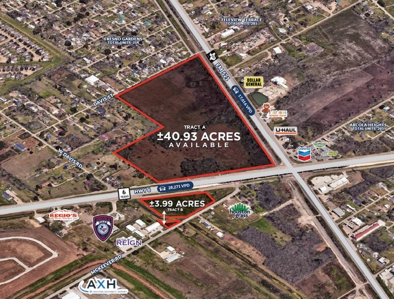 44+ acres with 2,100 linear feet of frontage on Hwy 521. Located at the northwest quadrant intersection of Hwy. 521 and Hwy. 6 with close proximity to Fort Bend Town Center and growing residential communities in Arcola/Missouri City. City water and sanitation available. Ideal for industrial, commercial or residential development. Total Size - ±44.92 Acres Tract A - ±40.93 Acres Tract B - ±3.99 Acres