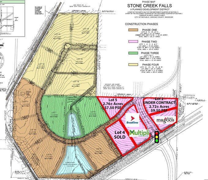 Commercial lots for sale in 92 acre Stone Creek Falls Development in Republic, MO. Stone Creek Falls is a mixed-use subdivision with 16 multi-family housing lots and 5 commercial lots. The development will incorporate the realignment of the US Hwy 60 and State Hwy MM intersection which will support traffic counts of up to 55,000 cars per day. The lots will feature man-made lakes with fountains and trails. Brought to you by the same development team that built Golden Pond, Old Stone, and 60 West, this project will bring jobs and housing to the City of Republic. Commercial Lots range from 2.5 - 4.07± Acres. Individual lots are priced from $7.50 - $10.00 PSF. Discounted pricing available for multiple lots. Contact listing agent for more information.