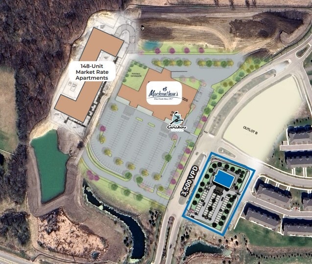 Adjacent to the newly opened Mackenthun’s grocer with Caribou Coffee and The Cove Wine & Spirits along with 148 unit market rate apartments