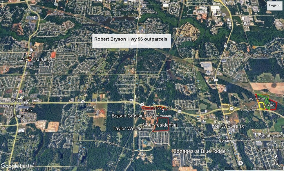 SE Pin corner of Hwy 96 and Robert Bryson Parkway. Zoned C-2 with all utilities and rough graded. Median Break on Hwy 96 as well as additional curb cuts onto Hwy 96 an option. Surrounded by 3 new subdivisions including a new 260 house development adjacent. Two more adjacent out parcels available. 1.42 acres for $425,000 and 1.56 acres for $399,000. Seller will consider a package price for all 3 tracts.