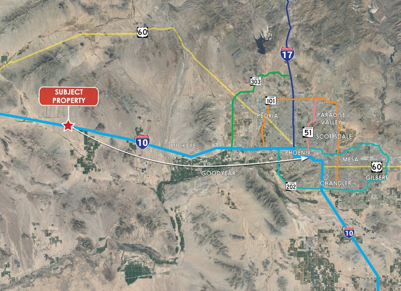 It is ± 30 miles from the City of Buckeye, Arizona, which is one of the fastest growth communities in the country. The City of Buckeye is located in the west valley of the Phoenix metro area. The site is ± 12 miles east of the Maricopa/La Paz County line and Exit # 69 on Interstate 10. It is ± 60 miles east of the California/Arizona state line.