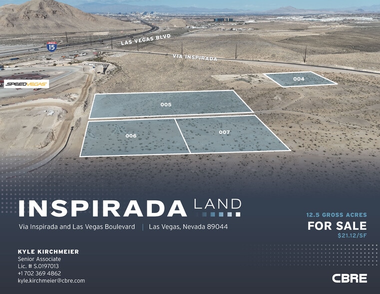CBRE is pleased to present approximately 12.5 acres of landwith potential for industrial development, which is located just East of Las Vegas Boulevard, on the Southern “gateway” to Las Vegas. The properties are adjacent to the 100 acre Speed Vegas Raceway track, The M Resort and Hotel, and the West Henderson/Las Vegas Strip corridors. The Properties are situated along the I-15 and have good visibility from the highway. The site is surrounded by various retail, multi-family, and hotel developments as well as the affluent master-planned communities such as Inspirada and Southern Highlands. The parcel(s) are currently zoned R-U (Rural Open Land) with planned land use of Entertainment Mixed-Use (EM) which allows for a variety of commercial usages. The sites also provide easy access to the I-15 via the Sloan Interchange. For more information please call Kyle Kirchmeier at 702-369-4862 or Michael Willmore at 702-343-0551.