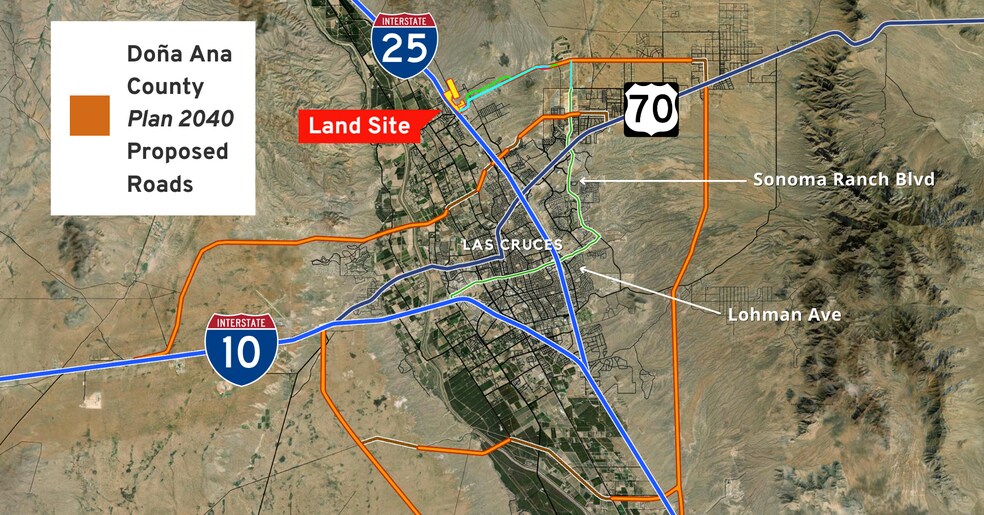 Fantastic opportunity to develop land parcels in burgeoning southern New Mexico/ Las Cruces region as well as ever expanding Borderplex (Las Cruces/El Paso/Juarez) ecosystem. Site sits along ±4272 feet of I-25 frontage. Future development plans* to connect I-25 & Thorpe Rd intersection with growing Sonoma Ranch/Desert Hawk Golf Course/Hwy 70 area provide opportunity for site to be gateway access from I-25 corridor. Available for retail, industrial, flex office or multi-family development.