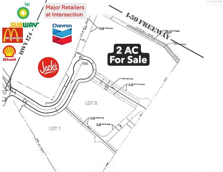 - 2 Acres - 87,120 Sq-ft - Zoning: B-2 - General Business District - 473 ft of I59 Interstate Frontage visibility! - Property previously cleared - Storm sewer system already installed