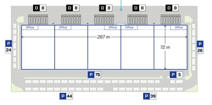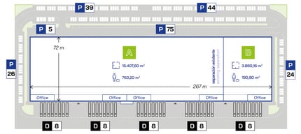 Módulo de 4.052 m², de los cuales 191 m² están destinados a mezzanina, ubicado en Panattoni Park Arasur sobre una parcela de 30.000 m². El almacén es divisible en un máximo de cinco módulos, cada uno con ocho muelles de carga y descarga, sumando un total de 40 muelles.