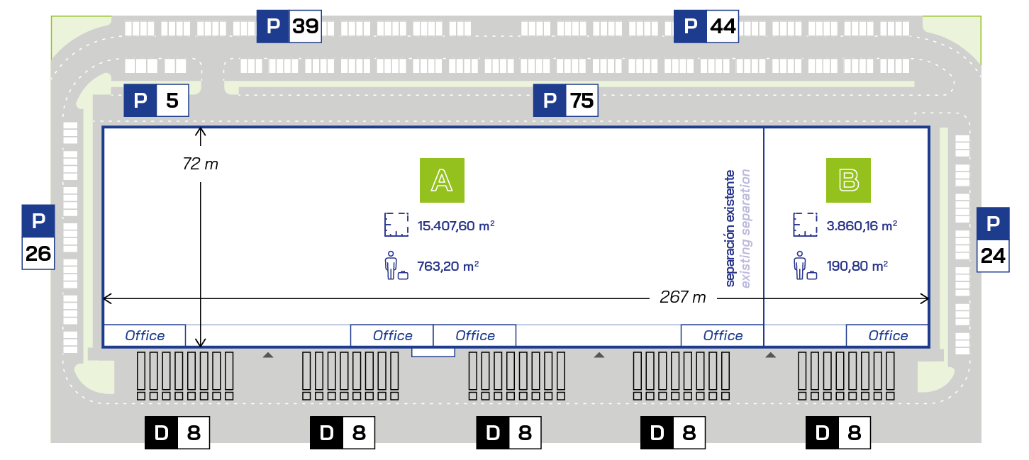 Nave llave en mano con unos 21000 m² projectados, de los cuales 954 m² están destinados a area de oficinas, ubicado en Panattoni Park Arasur. El almacén es divisible en un máximo de cinco módulos, cada uno con ocho muelles de carga y descarga, sumando un total de 40 muelles.