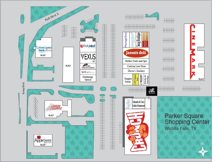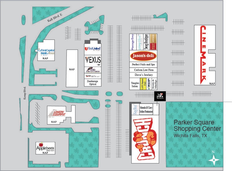 Located on Kemp and Kell Blvd. in Wichita Falls, this is a Class A shopping center in a Mulit-Mix site with tremendous opportunities. The center is anchored by Cinemark Movie Theater, Crunch Fitness and Jason's Deli. Ohter tenants include Dove's Jewelers, Perfect Nails and Spa, Tangles salon, Deatherage upscale optical, Swag Boutique, Carlson Law Firm, Massage Envy, Primp & Blow, SNOBA, Progress Pizza, Taki Ramen, First United Bank, Vexus, CBD Shaman and Lendmark Financial. The SE corner of Kemp /Kell (Hwy. 277/82) exposes Parker Square. Located on a major intersection with 25,000 foot traffic daily, this center is sure to have high populations daily. The Regional Market is large and income Demographics support the regional traffic visibility.