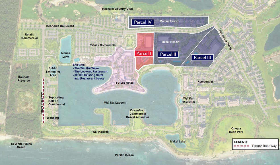 - Wai Kai at Hoakalei is the oceanfront crown jewel of Ocean Pointe/Hoakalei, an 1,100-acre world class mixed-use community that includes 4,000 homes, resort/retail, golf course and visitor amenities including the Hawaii’s first standing wave pool. - Parcel I includes a 5.5 Acres waterfront parcel intended to include a ±225-Room full-service luxury hotel. - Flexible resort entitlements in place to allow for a total 950 keys across multiple parcels. - Parcel I continues the development of the in-place amenities that include 30,000 square feet of restaurant/retail, Hawaii’s first standing wave pool, and an enclosed lagoon with recreational amenities for residents and guests. - Utilities are delivered to the rough-graded site. - The developer has invested hundreds of millions in development and infrastructure over the past 35 years of ownership. - Located in Ewa Beach in West Oahu, Wai Kai at Hoakalei is closer to the Honolulu Airport and Waikiki than the Ko Olina Resort area.