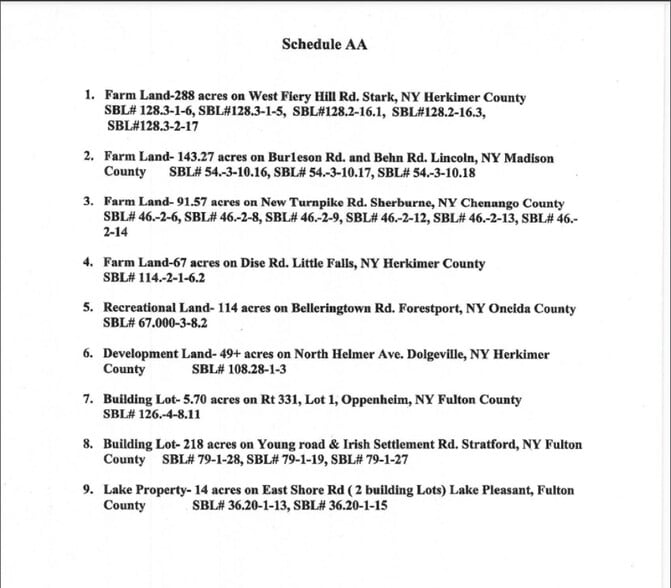 This diverse offering covers 225 acres, organized into 4 distinct parcels in NYS(schedule AA). 114 Acres of Recreational Land great for hunting in Forestport NY. 91 acres of farmland in Sherburne NY and 14 acres of waterfront property with 2 building lots.