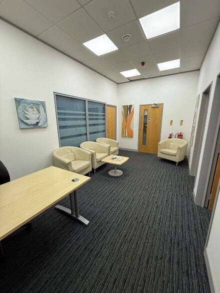 The ground floor has been partitioned to provide a combination of well presented and fully fitted open plan and cellular offices including a board room, 3 executive offices, comms room, kitchen break out area and has its own male, female and disabled WC’s. The offices are all carpeted and have suspended ceilings with recessed LED lighting and comfort cooling/heating cassettes. There is a roller shutter loading door into the floor although this has been covered over internally but could be easily reinstated if required for delivery access