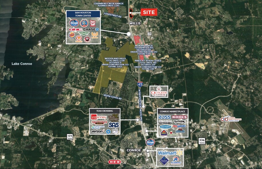 Prime Development or Investment Opportunity in the Path of Growth – I-45 North Corridor, Willis, TX Strategically located at the northeast corner of I-45 and Long Street, this tract sits just one mile north of the Willis retail hub at I-45 and FM 1097. Positioned on the northern edge of the Willis trade area, the site offers exceptional visibility with over 2,200 feet of frontage along I-45 and access to utilities, making it ideal for immediate development or long-term investment Just 1.5 miles south, the Howard Hughes Corporation is actively developing The Woodlands Hills, a 2,000-acre master-planned community that will feature over 4,600 homes at full build-out. Other prominent communities in the area include Graystone Hills, Woodforest, April Sound, and Grand Central Park—further reinforcing the area’s residential momentum. On site detention is required, but underground solution is available per City of College Station Regional Connectivity & Growth Highlights: Less than 10 minutes to Lake Conroe, a major recreational destination, 5-minute drive to Conroe—recently ranked the fastest-growing city in the U.S., and with its unmatched location, strong surrounding development, and excellent regional access, this site presents a compelling opportunity to secure a foothold in one of Texas’ most dynamic growth corridors