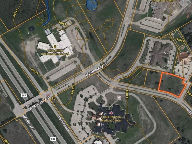 Prime commercial opportunity in one of Ennis’ fastest-growing corridors, with sites available from 1–3.9 acres along highly visible Hwy 287. Ideally positioned at Medical Center Drive and directly adjacent to Ennis Regional Medical Center, this location benefits from steady daily traffic generated by medical staff, patients, and surrounding service providers. The area is supported by nearby schools, established neighborhoods, and continued residential growth, creating strong demand for retail, medical, and service-based businesses. Convenient access to Hwy 287 provides a direct route to Waxahachie and the greater DFW metroplex, offering both local and regional exposure. Zoned CC (Corridor Commercial), these tracts allow for a wide range of development including medical office, retail, restaurant, and professional services—making this an ideal location for businesses looking to position themselves in a high-traffic, growth-driven area. A rare opportunity to secure commercial land in a corridor anchored by healthcare and poised for continued expansion.