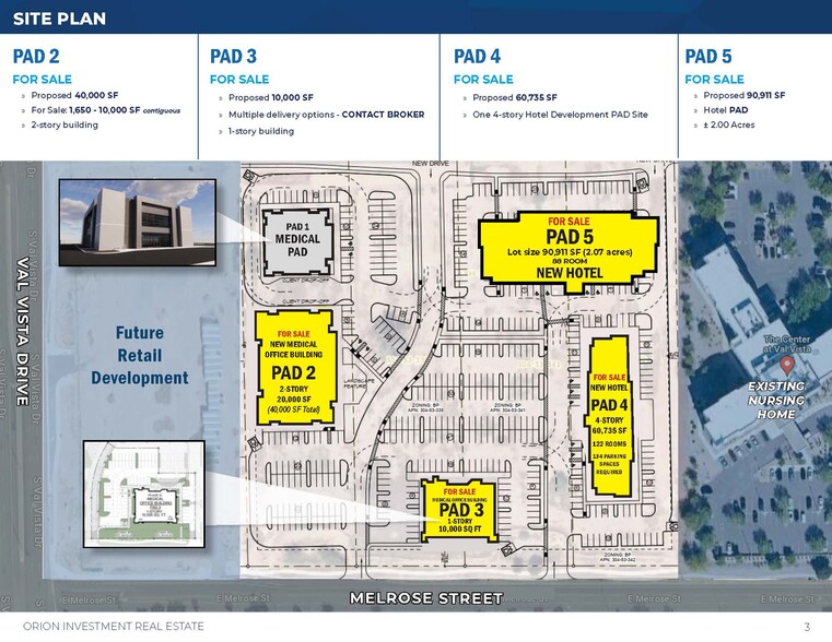 The ±9.44-acre assemblage is zoned Business Park BP, allowing flexible configurations for medical, wellness, and auxiliary commercial uses. Four distinct PADs are available for sale, including a proposed two-story medical building, a one-story medical building, and two hotel development sites designed to complement the area’s growing demand for patient-driven and visitor accommodations. Each site features improved lots with utilities at the lot line, providing a streamlined path for development.