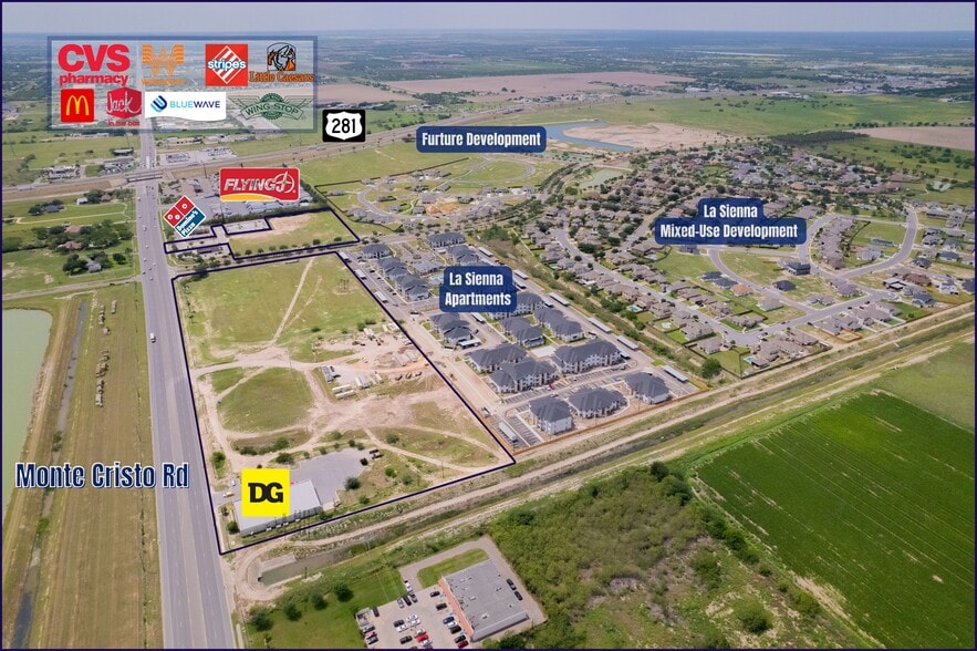 *Pad Sites available for Sale, Ground Lease or BTS *Proposed Retail available for Lease *New development opportunity in the rapidly growing sub market of Edinburg, TX *Part of the rapidly growing La Sienna mixed use development, which includes 460 existing Single Family Homes, 270 additional Single Family lots proposed, 288 existing Apartment Units and 282 proposed Townhomes *Close proximity to I-69C with over 61k Vehicles per day *Offers tremendous visibility and access from Monte Cristo Rd with over 22k Vehicles per day