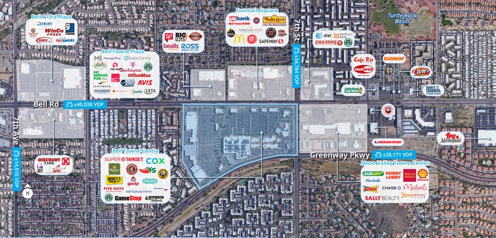 Remodeled infill power center, anchored by Super Target, with frontage on three heavily traveled roads - 7th St, Bell Rd and Greenway Pkwy. Junior anchor & retail shop space available. SWC 7th St & Bell Rd, one of the busiest intersections in North Phoenix.