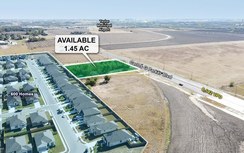 This 1.45-acre hard-corner parcel at Carlos G. Parker Boulevard and Pivot Drive offers a prime development opportunity in the rapidly growing city of Taylor, Texas. Positioned at the entrance of the Bull Creek neighborhood, which includes approximately 600 homes, the site benefits from strong residential density and consistent traffic flow of 8,542 vehicles per day along Carlos G. Parker Boulevard.