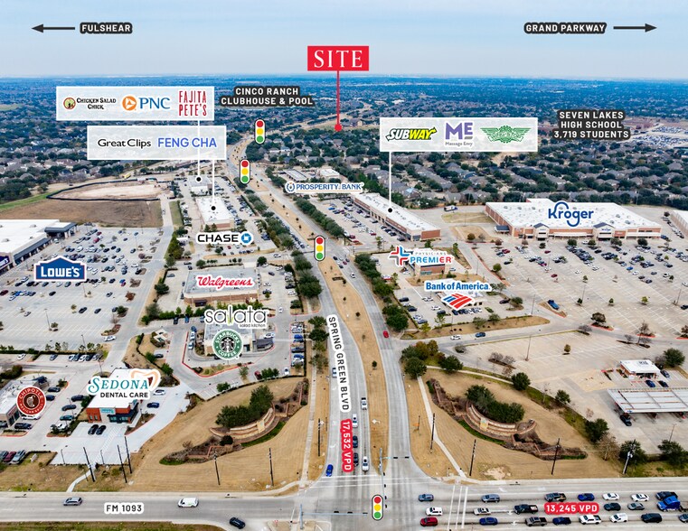 14,000 SF OF RETAIL SPACE & MULTIPLE PAD OPPORTUNITIES Location Highlights PRIME HIGH-INCOME, HIGH-GROWTH KATY LOCATION IN CINCO RANCH LOCATED ALONG SPRING GREEN BOULEVARD, HIGHLY TRAFFICKED CONNECTOR BETWEEN FM 1093, CINCO RANCH, AND KATY’S NORTHWEST EXPANSION IDEAL POSITIONING FOR RETAIL, QSR & DAILY-NEEDS OPERATORS This site benefits from strong commercial energy both to the east in Katy’s Cinco Ranch area and to the west toward rapidly expanding Fulshear. The Cinco Ranch side offers established commercial density, anchored by popular retail and dining destinations such as LaCenterra, making the area a proven draw for customers and daily traffic. Retail 14,000 SF Pads 1 - 0.77 AC 2 - 0.89 AC 4 - 0.77 AC
