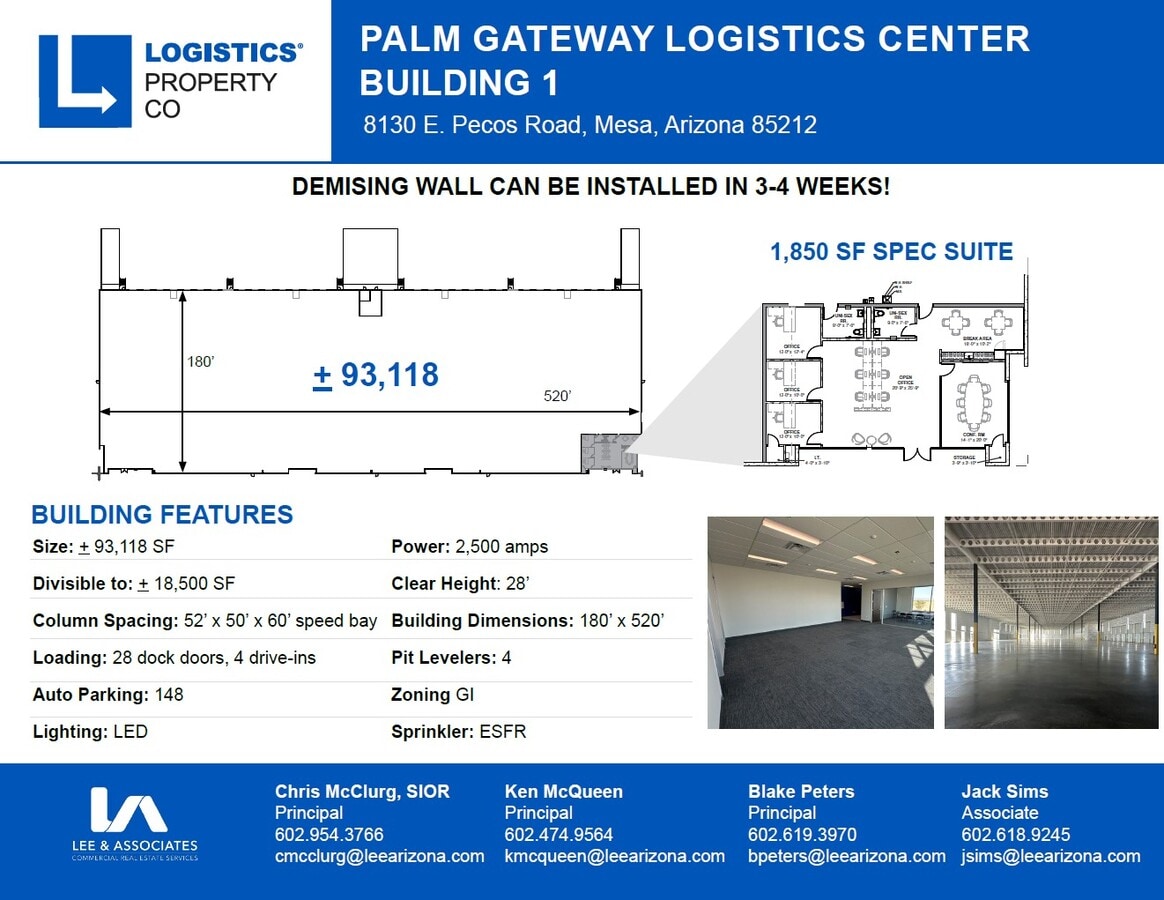 Building 1 of the Palm Gateway Logistics Center offers 92,841 SF divisible down to 18,500 SF with 28 dock doors, 4 drive-ins, a 28' clear height, LED lighting, ESFR sprinklers, 2,500 Amps of heavy power, and 148 auto stalls. 1,850 SF spec suite, demising wall can be installed in 3-4 weeks. Call for additional property and leasing details.